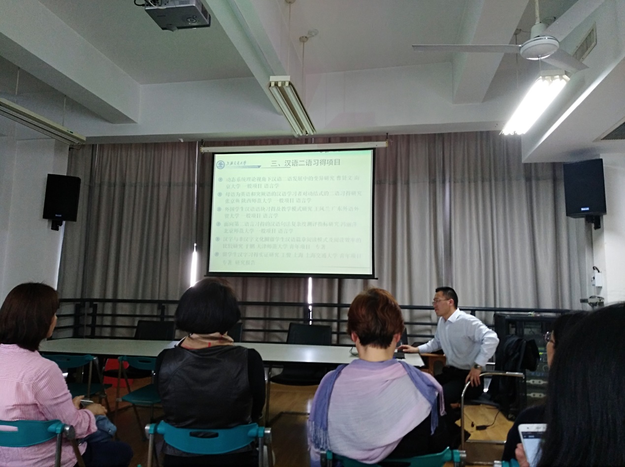 讲座伊始,赵院长向在场师生简单介绍了常教授,全场报以热烈的掌声。接着,常教授围绕主题,梳理历年来有关汉语二语研究的国家社科基金项目和教育部人文社科基金项目,结合本人主持的国家社科基金青年项目、重点项目以及教育部人文社科基金青年项目,探讨社科项目的选题、项目书的撰写、项目的实施与结项等。常教授指出,做研究要依照“跟跑—并跑—领跑”的路线,在前人的基础上创立自己的新角度,引领学科发展。常教授还结合自身经历,鼓励学生积极培育学术精神,指导老师正确从事科研创作。