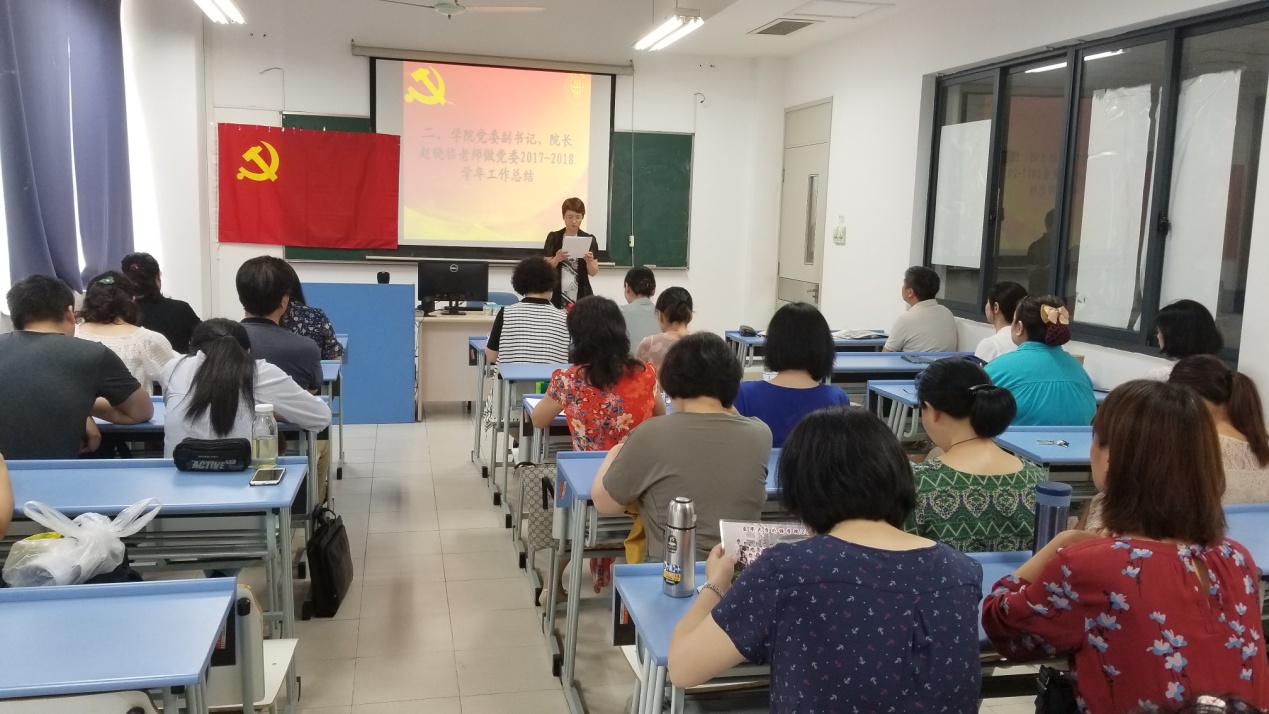 大会在雄壮的国歌声中拉开帷幕。beat365官方网站党委副书记、院长赵晓临老师向全体党员做了党委2017-2018学年工作总结。她表示,在这一学年中,beat365官网党委将支部建设与系部建设以及学科建设有机结合,无论是在日常教学或社会服务工作中,还是在教改项目申报等重大工作中,支部成员都积极参与、以身作则,起到了模范带头作用,发挥了支部的战斗堡垒作用。