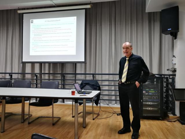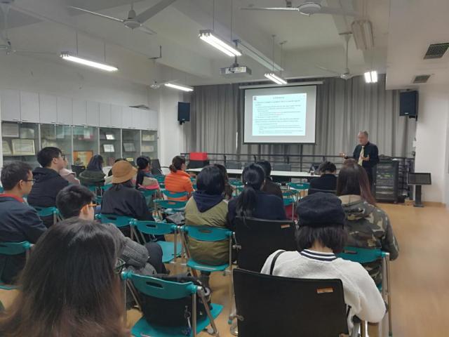 讲座首先探讨了中国学者学习英语很困难的一些历史和文化原因,以及在学生、教师甚至经验丰富的翻译人员身上都会反复犯的一些英语错误。此外,David老师还讲解了English(英语)、Chinglish(中式英语)、Wronglish(偏误英语)的区别,分类列举中式英语常见顽疾,并用很多常见但易犯错误的小词举例说明不规范的英语使用,比如including, such as,as well as,and so on, what’s more, besides, not only…but also等等,并解释如何识别、理解和纠正这些英语错误。讲座持续将近两个小时,老师和同学深入互动,学术氛围融洽。