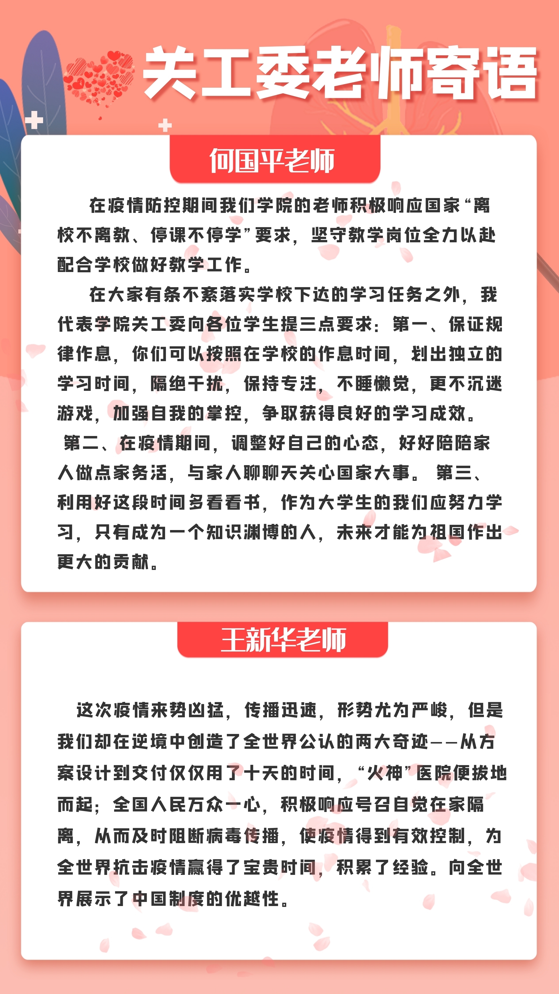 新冠肺炎疫情发生期间,为深入学习贯彻习近平新时代中国特色社会主义思想,大力弘扬新时代爱国主义精神,围绕学校中心工作,加强入党积极分子的培养力度,切实提高大学生党员发展质量,beat365官方网站党校在beat365官方网站党校和beat365官方网站党委的指导下,根据学校和学院关于加强党员发展和教育管理工作的部署和相关要求,秉持培养不断线的原则,采取“云开班 云动员”、“云学习 云讨论”、“云寄语 云结业”的模式,进一步帮助入党积极分子深入学习领会习近平新时代中国特色社会主义思想,认真学习党史国史,严格遵守党章与党纪党规,坚定中国特色社会主义道路自信、理论自信、制度自信、文化自信,坚持爱党爱国爱社会主义相统一,发挥模范引领作用
