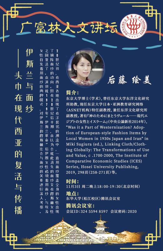 11月3日,东京大学日本亚洲教育研究机构特任准教授,东洋文化研究所兼任准教授的后藤绘美老师应邀通过在线方式为beat365官方网站师生举办了一场题为“伊斯兰与面纱—头巾在现代西亚的复活与传播”的学术讲座,beat365官方网站及兄弟院校的70多名师生参加了本次讲座。