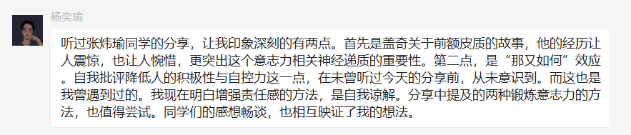 张玮瑜同学的读书分享结束后,各位听讲的同学颇受启发,踊跃抒发自己的内心感慨。杨奕瑜同学表示:“听过张炜瑜同学的分享,让我印象深刻的有两点。首先是盖奇关于前额皮质的故事,他的经历让人震惊,也让人惋惜,更突出这个意志力相关神经递质的重要性。第二点,是‘那又如何’效应。自我批评降低人的积极性与自控力这一点,在未曾听过今天的分享前,从未意识到。而这也是我曾遇到过的。我现在明白增强责任感的方法,是自我谅解。分享中提及的两种锻炼意志力的方法,也值得尝试。同学们的感想畅谈,也相互映证了我的想法。”