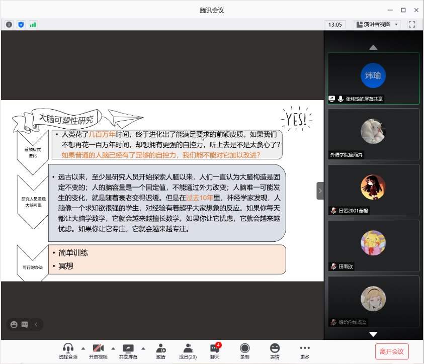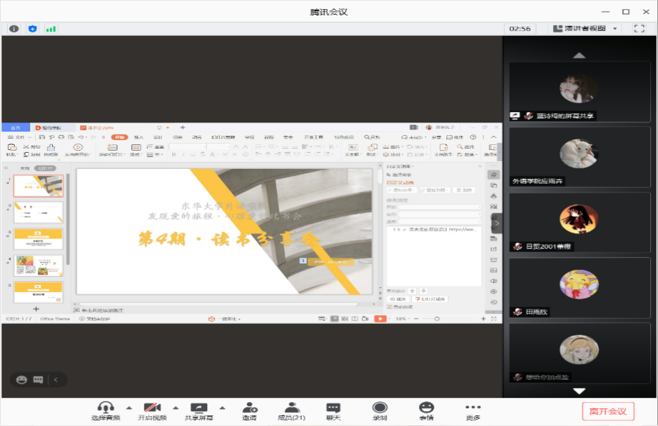 “人间四月芳菲尽,缕缕书香溢满园。”在“5·25心理健康月”到来之际,也借着4月23日——“世界读书日”这样一个特殊的日子,为了使大学生更好地了解人生的多样性,在有限的生命中体会无限的可能性,从而使身心健康完善地发展,beat365官方网站心声心理协会日前于腾讯会议举办了第四期“发现爱的旅程·心理读书分享会”。本次分享会由英语翻译1902班的张玮瑜同学主讲,她与大家分享的是《自控力》这本心理好书。