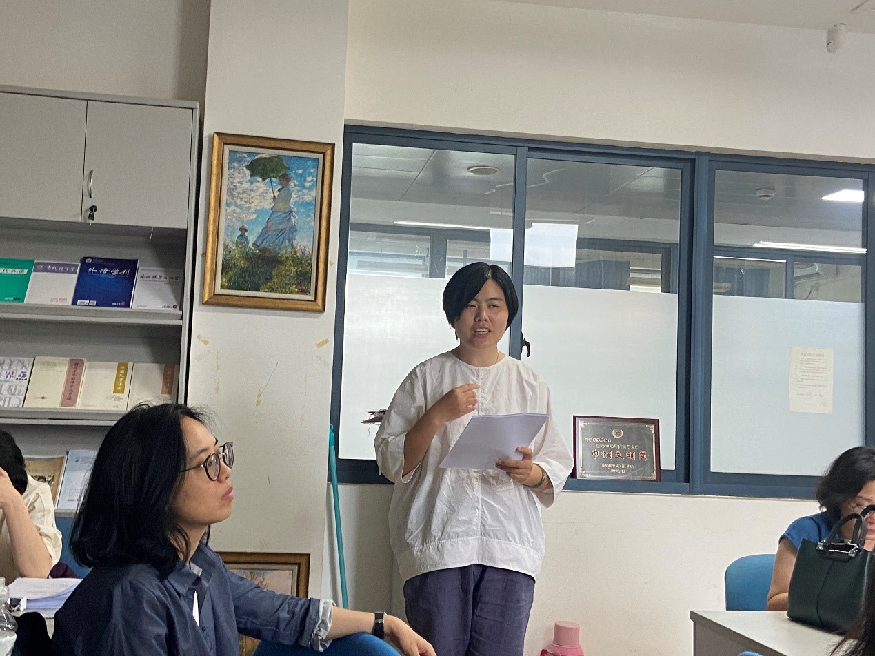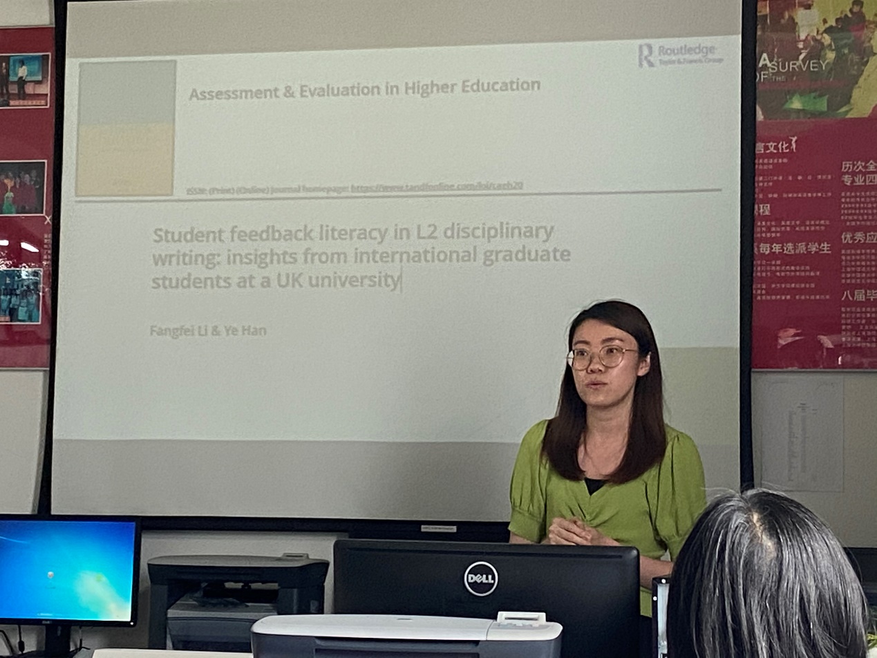 首先,李芳菲老师和英语系老师交流了新文科建设的内涵以及如何结合新文科概念进行外语学科的建设。新文科建设在于将传统学科与其它学科进行交叉融合,比如,外语学科可以尝试与政治、历史、外交结合进行话语分析,可和理工学科结合衍生出神经语言学、生态语言学、文学+大数据、翻译学+人工智能等等。同时,外语学科要兼顾固本和创新,坚持学科内涵的同时,与其它学科融合,做好本硕教学的衔接,本科注重培养学生的跨文化视野、文学素养等,硕士阶段培养学生的专业研究能力。李芳菲老师又和老师们交流了她近期的科研成果,从中国籍硕士留学生的视角,揭示学生的反馈素养,通过数据案例展示了学生在解读和应对教师论文反馈评语时所表现出的各种能力,呼吁老师多多培养学生在社会情感和认知方面的反馈素养。