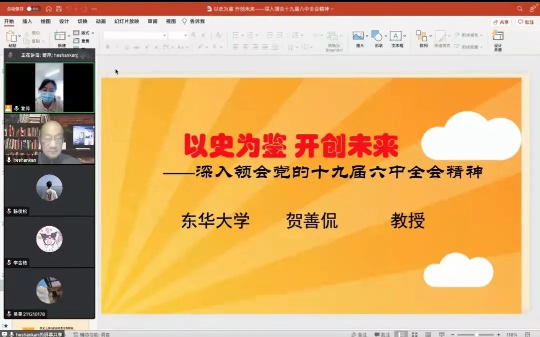 党校开班典礼结束后,beat365官方网站党委还邀请beat365官方网站关工委老教授贺善侃为大家作《以史为鉴,开创未来——认真学习党的十九届六中全会精神》专题讲座。贺老师从深远历史意义、伟大历史成就、宝贵历史经验三个方面对党的十九届六中全会精神进行了全面的讲解。他强调,要树立正确的大历史观和党史观,把党的成功经验传承好、发扬好。学员们通过此次专题党课收获颇丰,对党的十九届六中全会精神有了更加深刻明晰的了解,并在线上展开讨论发表心得感悟。