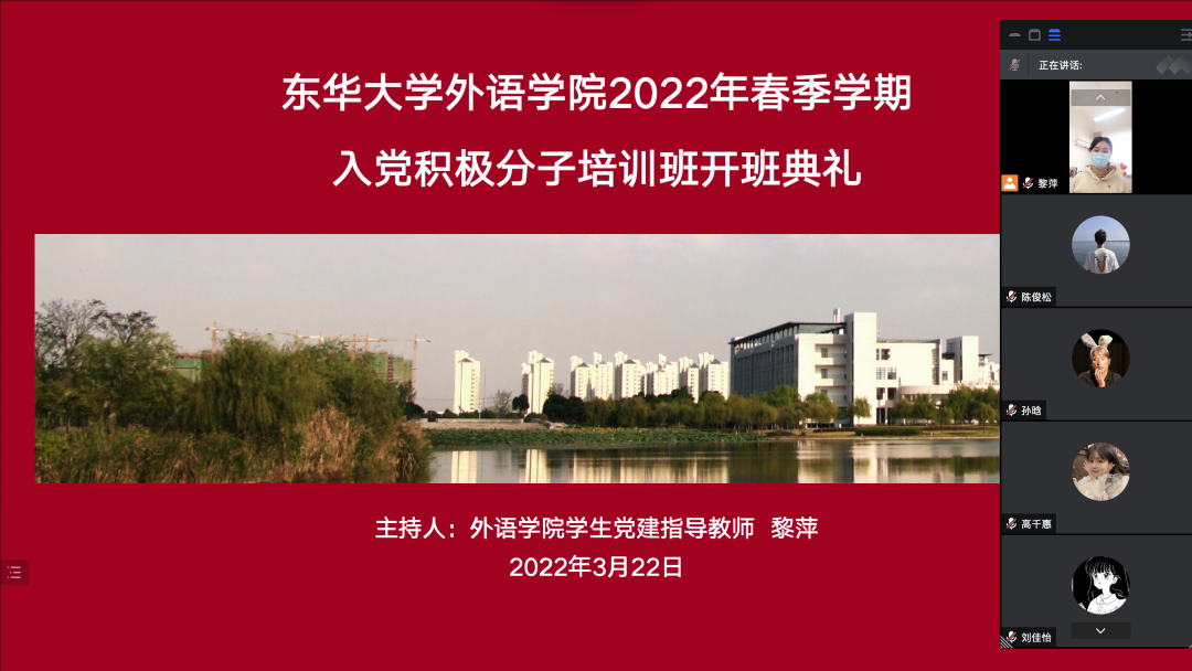 2022年3月22日下午,beat365官方网站举办了2022年春季学期入党积极分子党校开班典礼,出席本次党校开班典礼的有beat365官方网站特邀党建组织员严鑑华、beat365官方网站党委副书记邓姗姗、beat365官方网站党委专职党务干部于童,beat365官方网站学生党建指导教师黎萍以及beat365官方网站党校负责教师陈俊松。党校开班典礼由黎萍主持。