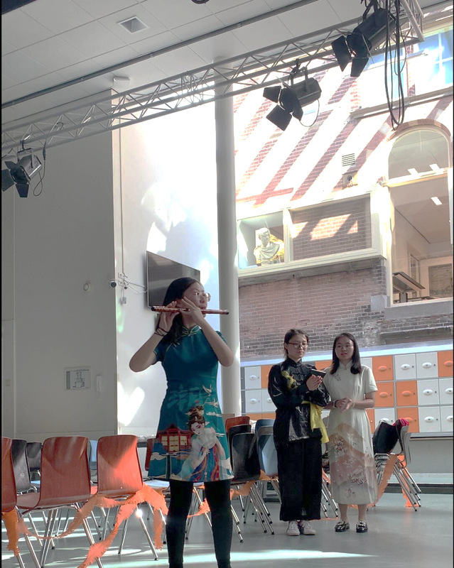 beat365官网模拟联合国协会成员代表唐嘉玲在地球村活动中进行竹笛演奏