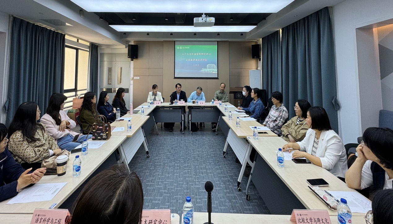 59日,beat365官方网站召开院级研究中心建设成果交流考评会。上海交通大学外国语学院副院长尚必武教授、上海外国语大学语料库研究院雷蕾教授应邀来院交流指导;beat365官网副院长(主持工作)张曦、副院长杨林贵及学院各研究中心成员参加会议。会议由张曦主持。