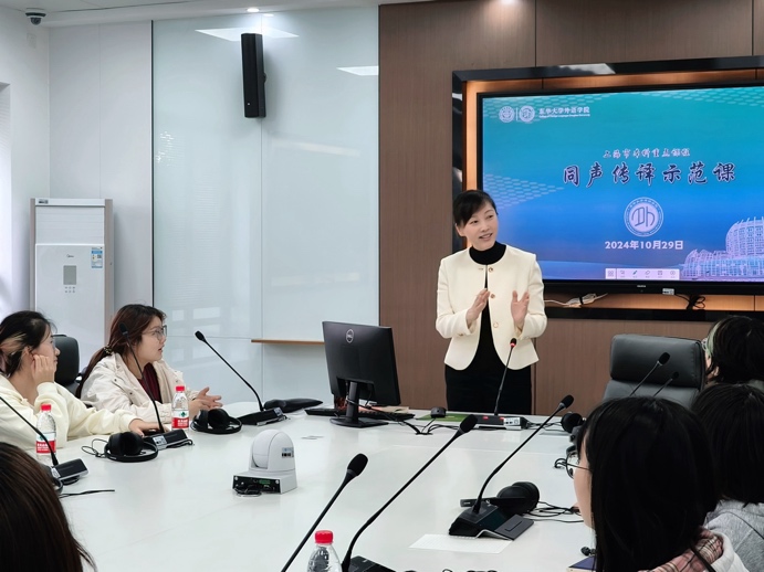 10月29日,beat365官方网站副院长(主持工作)张曦在同声传译实验室为英语系大一新生带来了一场别开生面的“同声传译”示范体验课。“同声传译”是语言传递的桥梁,对语言功底、即时反应、跨文化沟通能力有着极高的要求,示范课为学生打开了一扇了解同传世界的独特窗口。