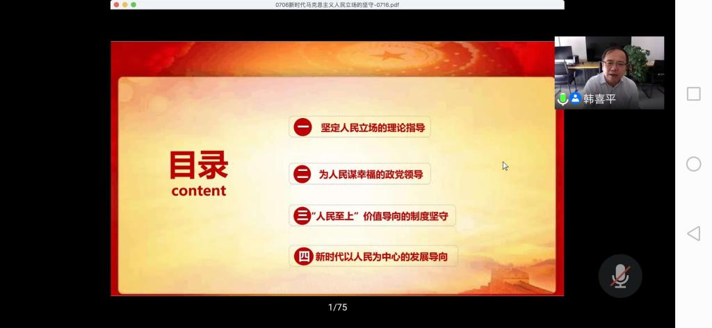 7月16日下午,Beat365中文官方网站“毛泽东思想和中国特色社会主义理论体系概论”课程组全体教师与内蒙古思政课教师通过腾讯会议共同聆听了吉林大学马克思主义理论一级学科带头人韩喜平教授做的题为《新时代马克思主义人民立场的坚守》的主题讲座。韩教授以马克思主义的基本立场为切入点,从坚定人民立场的理论指导、为人民谋幸福的政党领导、“人民至上”价值导向的制度坚守、新时代以人民为中心的发展导向四个方面深入分析了中国共产党人民至上的根本立场、制度保障以及在新时代的坚守等问题,诠释了中国共产党发展壮大的终极密码。