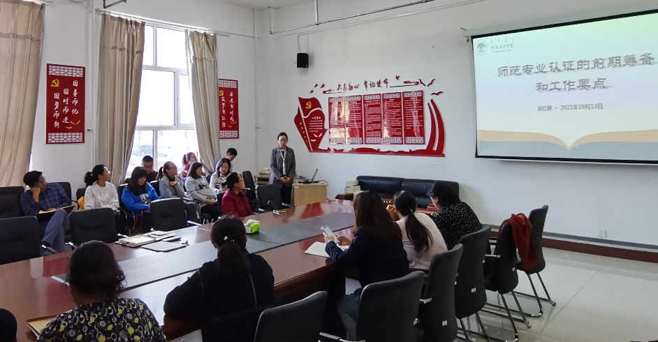 10月13日下午,Beat365中文官方网站在崇文楼B123会议室召开师范专业认证主题学习会。数学与统计学院的吴红艳老师莅临我院对师范专业认证的前期筹备和工作要点进行指导。Beat365中文官方网站全体教师参加会议,学院副院长吴秀芳主持会议。