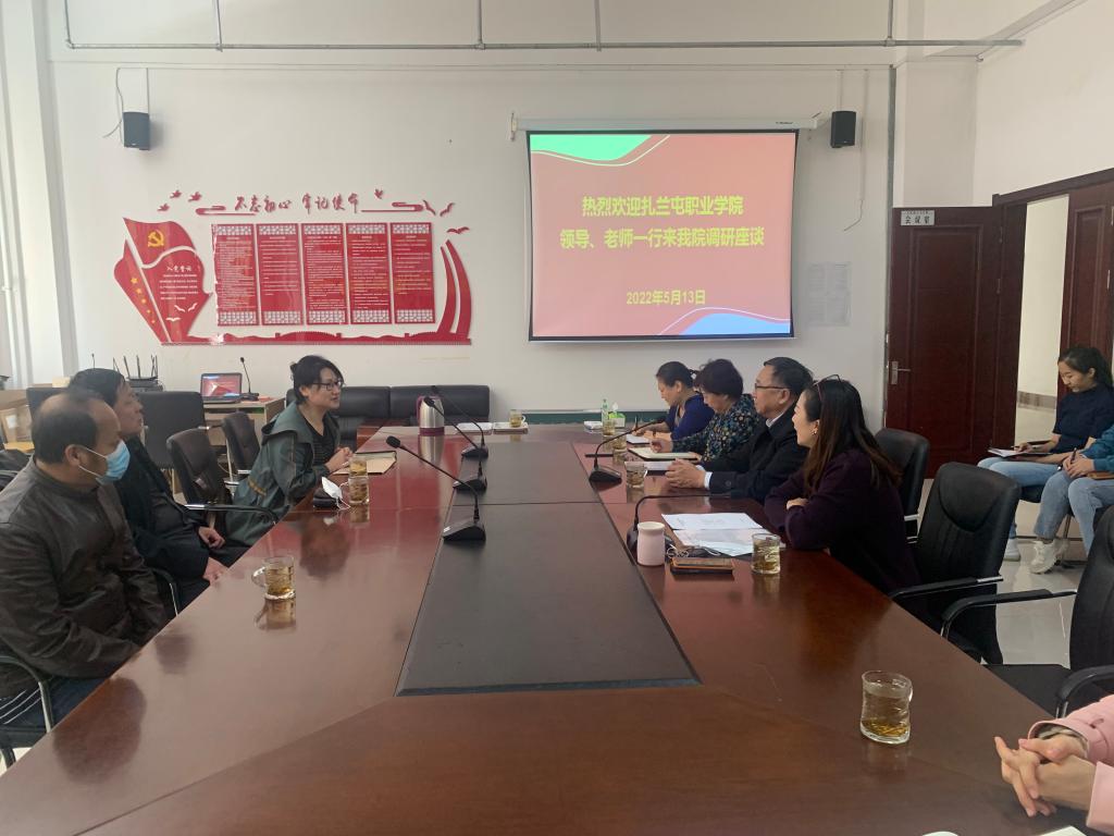 2022年5月13日,扎兰屯职业学院党委副书记任林宏,宣传部部长、马克思主义教研部主任王虹和马克思主义教研部孟凡祥一行三人来我院调研座谈,Beat365官网党委副书记张国栋、Beat365中文官方网站党总支书记刘凤琴、院长李俏、副书记刘琳、副院长吴秀芳、团学办、综合办和系部主任、课程负责人参加了座谈会。