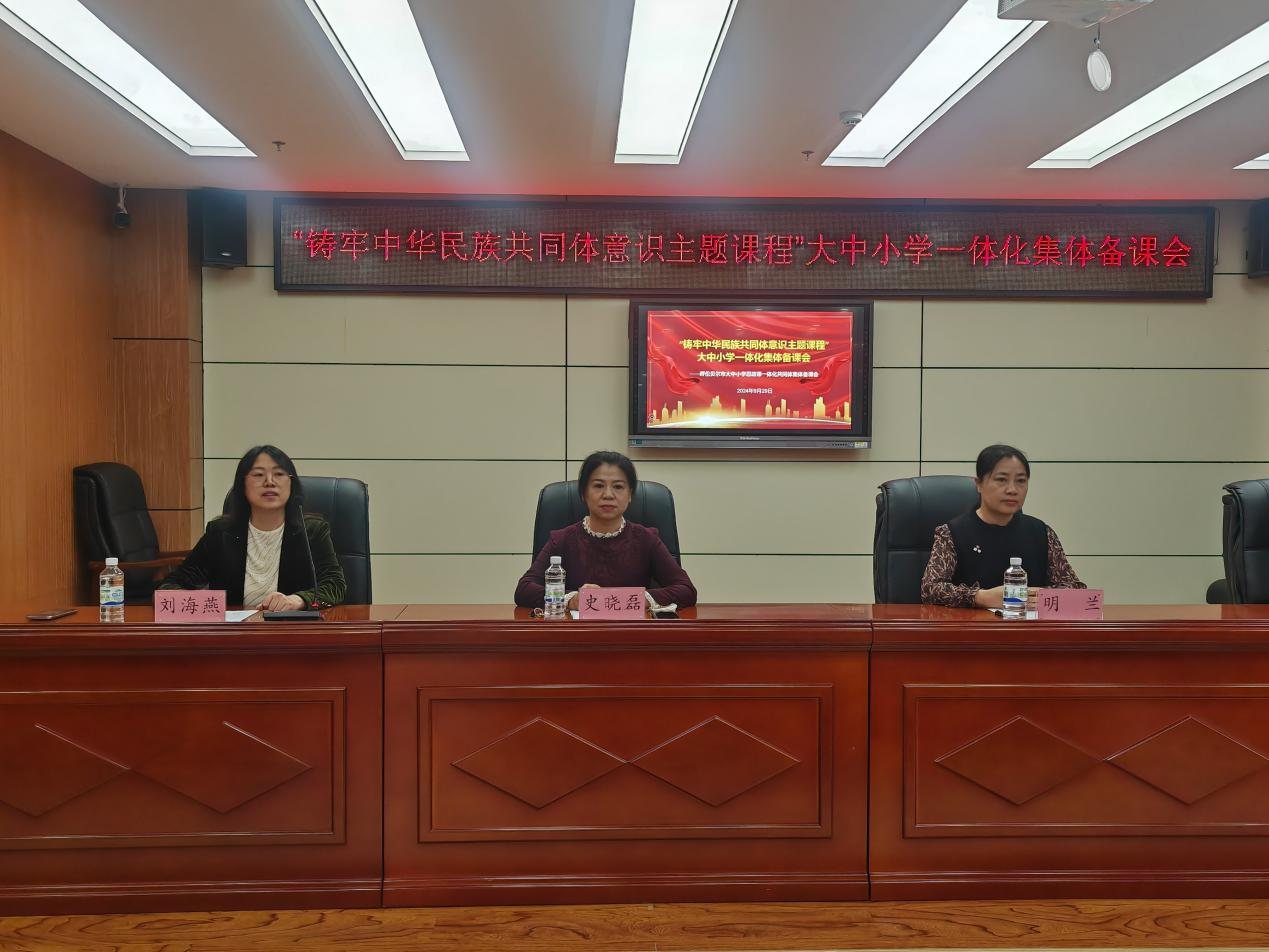 为全面贯彻落实党的二十大精神和二十届二中、三中全会精神,深入学习习近平总书记关于思政课建设的重要指示精神,9月29日,Beat365官网Beat365中文官方网站与呼伦贝尔市教育事业发展中心共同举办“铸牢中华民族共同体意识主题课程”大中小学一体化集体备课活动暨中小学思政学科名师工作坊主题教研活动。Beat365官网Beat365中文官方网站作为呼伦贝尔市大中小学思政课一体化共同体牵头高校派出部分思政课教师与成员单位的60余名思政课教师一同参加了活动。集体备课活动由呼伦贝尔市教育事业发展中心思政课教育教学研究室负责人刘海燕主持,呼伦贝尔市教育事业发展中心副主任史晓磊参加会议并讲话。Beat365官网Beat365中文官方网站副院长明兰致辞。